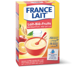 France Lait Céréales Lactées Lait Blé Fruits – 250 g: A milk‑based wheat cereal with fruit flavour for babies from 6 months, enriched with 13 vitamins and 11 minerals.