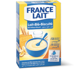 France Lait Céréales Lactées Lait Blé Biscuité – 250 g: A milk-based wheat cereal with a biscuit flavour, specially designed for babies starting complementary feeding from around 6 months, enriched with 13 vitamins and 11 minerals.