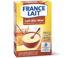 France Lait Céréales Lactées Lait Blé Miel – 250 g: A milk‑based wheat cereal flavoured with honey, specially designed for babies from 6 months of age, enriched with 13 vitamins and 11 minerals.