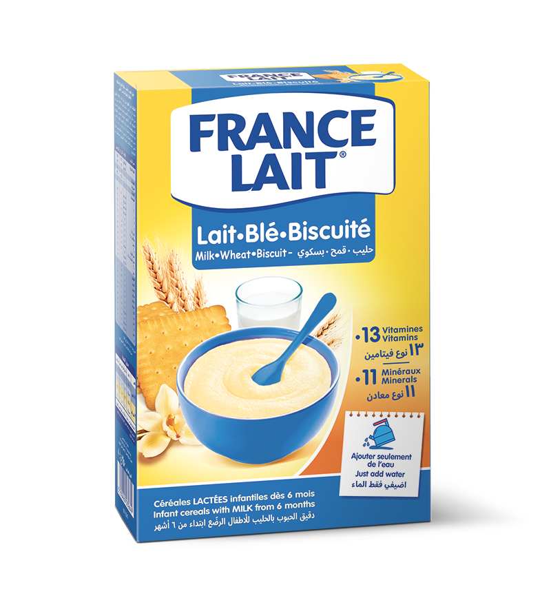 France Lait Céréales Lactées Lait Blé Biscuité (250 g) is a premium cereal product formulated to accompany healthy infants from around 6 months onward as they begin complementary feeding. The recipe combines wheat flour (partially hydrolysed for improved digestibility) and milk powder (origin France) with a pleasant biscuit taste that helps ease the transition to more varied textures and flavours.